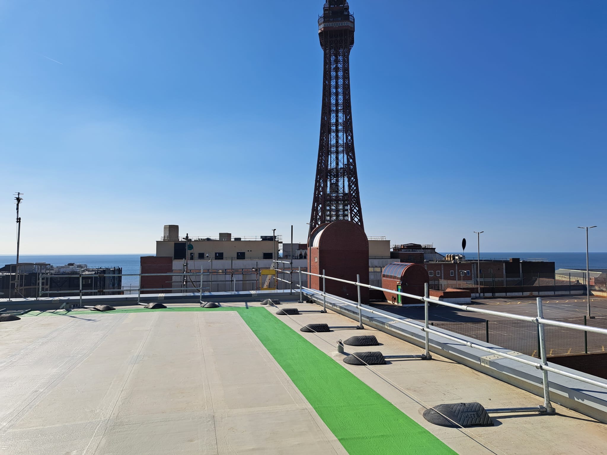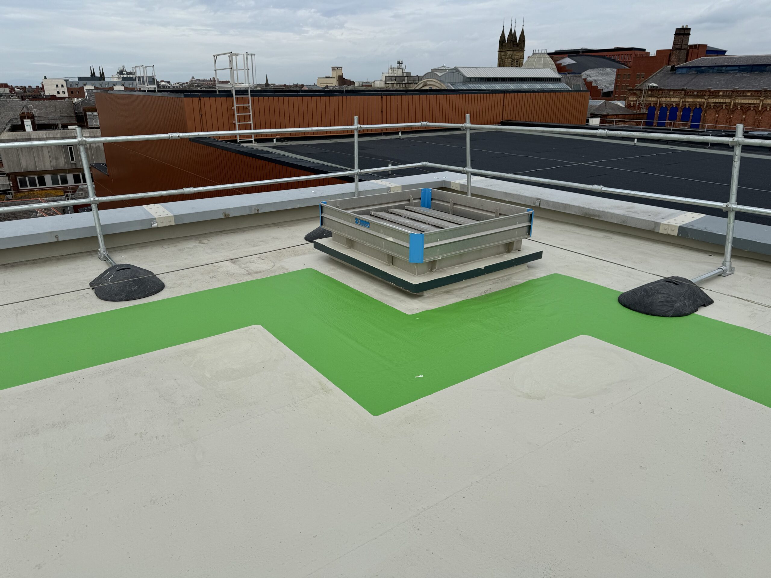 Due to the high number of defects found we advised our client to a suitable overlay system utilising Westwood Wecryl  PMMA system. A non slip walkway was installed on the perimeter edge of the roof inside the edge protection for future Maintaince / Access etc.